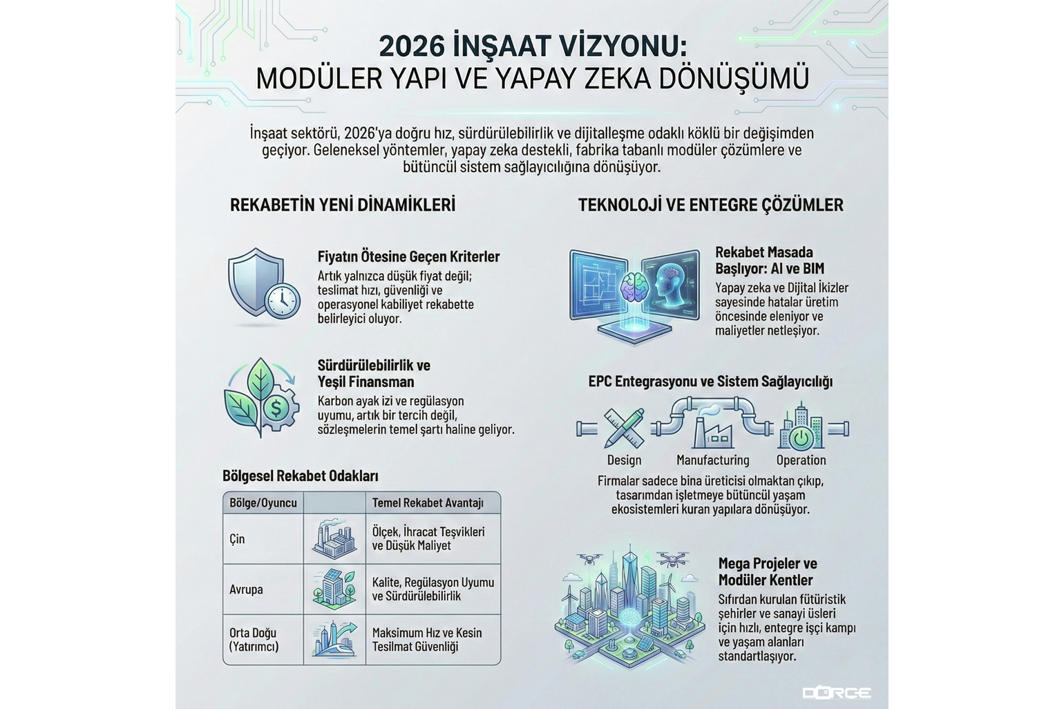 Çünkü 2026’ya giderken pazarda belirgin bir ayrışma yaşanmaktadır. Geleneksel müteahhitlik modeliyle çalışan firmalar, giderek daha fazla biçimde EPC entegrasyonuna, dijital tasarım (Building Information Modeling: Yapı Bilgi Modellemesi), yapay zekâ endeksli araçlar ve çalışma şekilleri ve fabrika kontrollü tabanlı üretime yönelmektedir. Büyük EPC oyuncularının kendi modüler üretim kapasitelerini kurması ya da bu alanda stratejik ortaklıklara gitmesi, pazarın yapısını hızla değiştirmektedir. Önümüzdeki dönemde daha az sayıda ama daha güçlü, daha entegre ve daha küresel oyuncunun öne çıkması şaşırtıcı olmayacaktır.